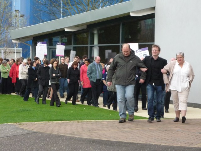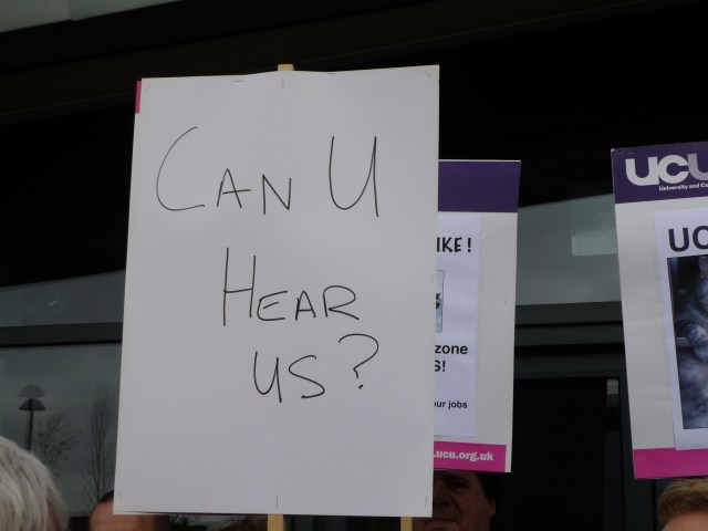 Despite union posters asking if the Principal was actually listening being removed from noticeboards throughout the university, apparently on the orders of senior management, a dignified, silent demonstration of staff concerned about cuts went on to be held outside the Principal’s official ‘listening event’ in the staff coffee bar, today, Thursday 7th April.