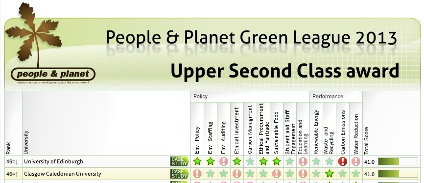 Glasgow Caledonian has increased its position in this table from 59th to 46th – following on from a previous increase the year before. Latest figures show us having achieved 41 points out of 70 on a wide ranging set of issues from our approach to fair trade, to whether we have a carbon management plan.