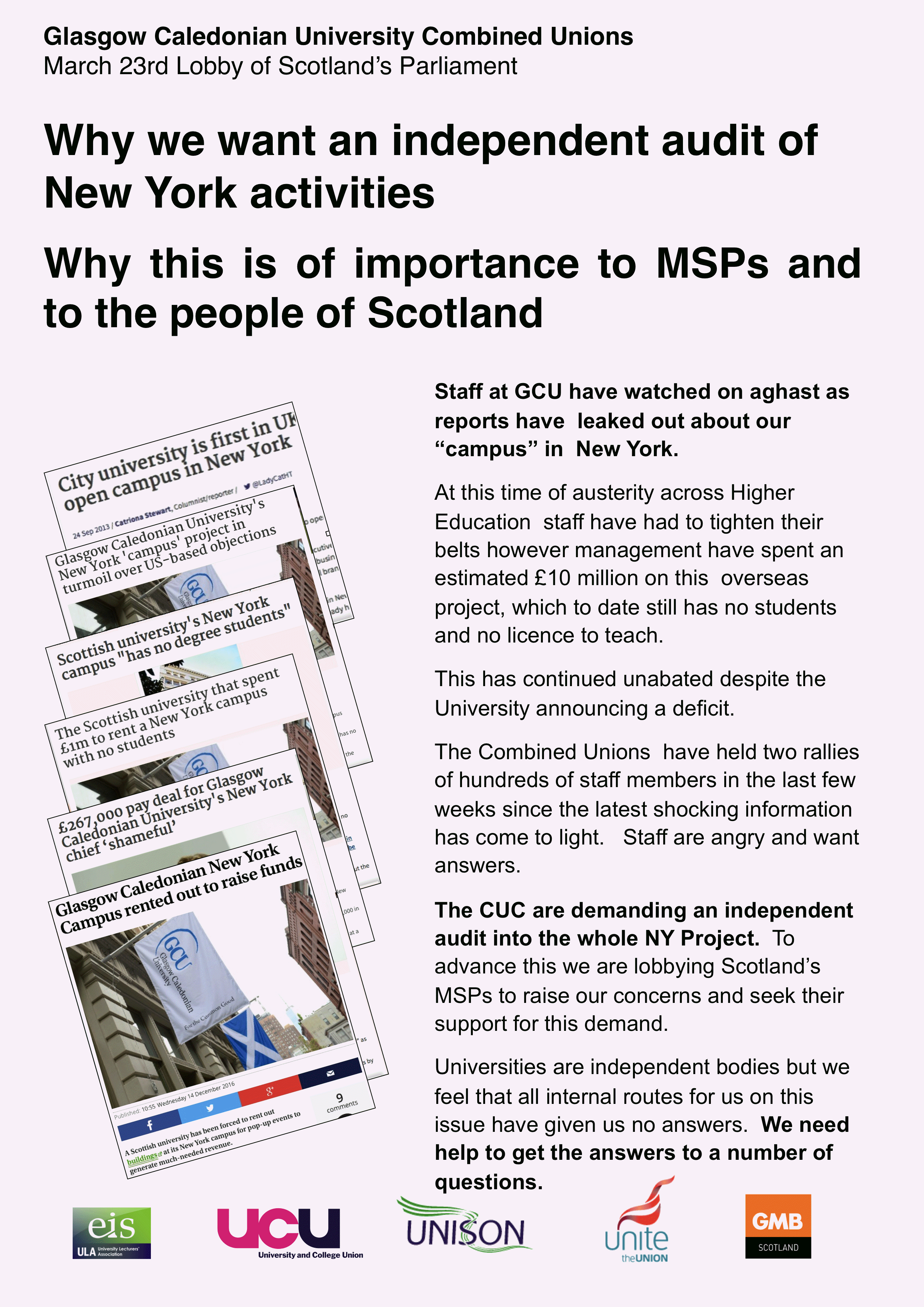 Following the dreadful events at Westminster yesterday, and the knock-on impact on today’s proceedings at Holyrood, campus unions consulted with the MSPs who had agreed to meet us to discuss shared concerns regarding the GCU campus in New York.