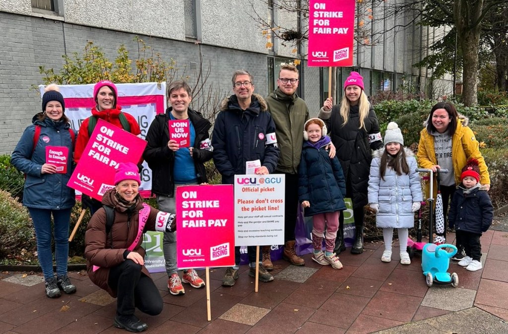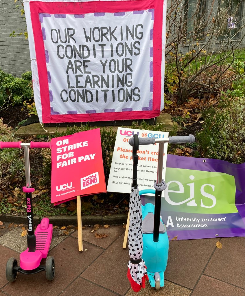 He said: It’s a long time since the unions on campus took joint action…..We watched as the management have invested the money of the university, not in staff, but in renaming buildings, in campuses overseas, and in New York, where $25million of debt is hanging round the university. Twenty Five Million – can you imagine the transformation that would have made for our student experience, for our students who again have supported us on the Picket line here today…..If we had only had decent salary scales for the poorest workers in Higher Education, and fair salaries for lecturers, and permanent contracts for new starts within the Higher Education system. We could have done that, here in GCU, but the decision was not to do that, but to spend on overseas adventures and to fatten the fat cats even more at the top of the university.