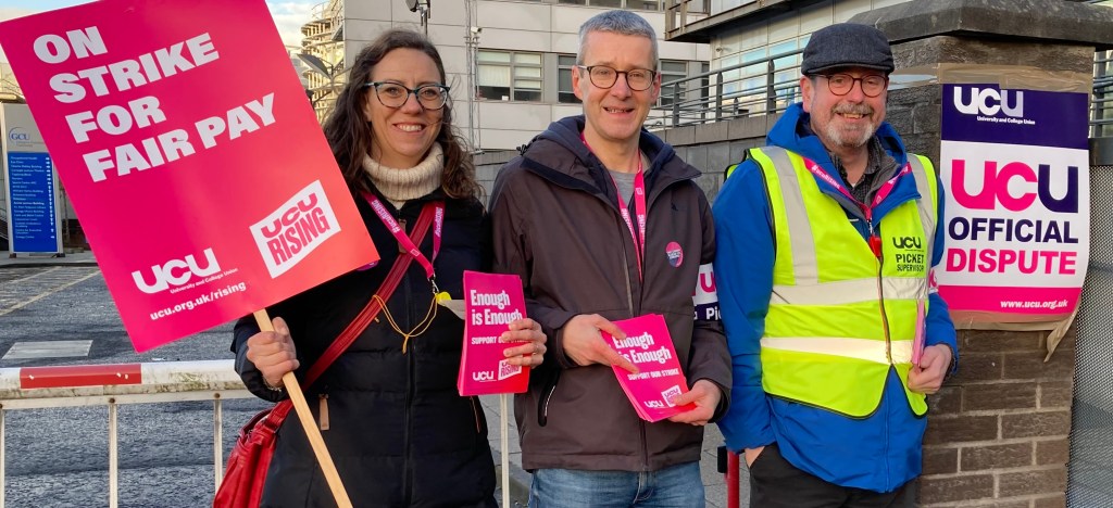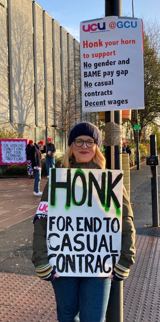 Conversations on the picket line covered our Principal, Pamela Gillies’ statement in the Times Higher Education magazine (Download paywall free version here) that “We’ve been underpaying our staff for many, many years, and our staff really are angry now” and her belief that “Our staff are our jewels in the crown, and we need to properly reward them”, and the interview this morning with Mary Senior of UCU on Good Morning Scotland telling listeners that “we are in an unsustainable situation” (listen here: from 1:40:57 to 1:46:38). Also discussed was the appearance of UCU General Secretary Jo Grady on yesterday’s newsnight programme demolishing the ‘car crash’ arguments of UCEA’s Raj Jethwa who colleagues believed had come across as a bit of an automaton.