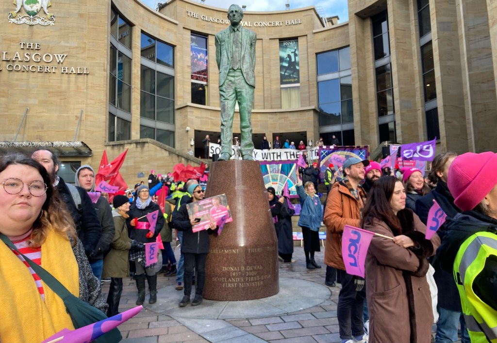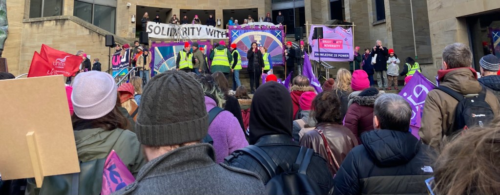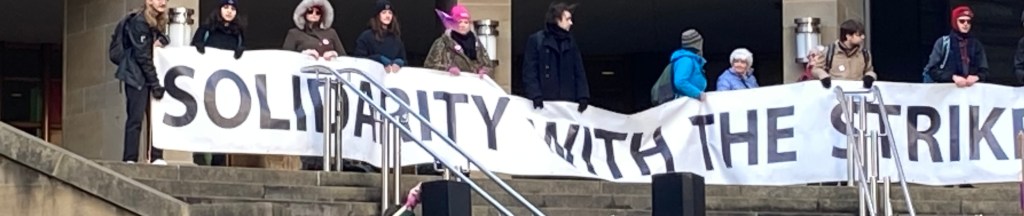 After a brief respite in the Student Association building for hot drinks (thanks for the offer of using your facilities colleagues!) we joined the rally at the Donald Dewar statue which heard a series of inspiring speakers. Dewar was his usual dour self looking down at the strikers, but I recall he was never one to favour industrial action personally.