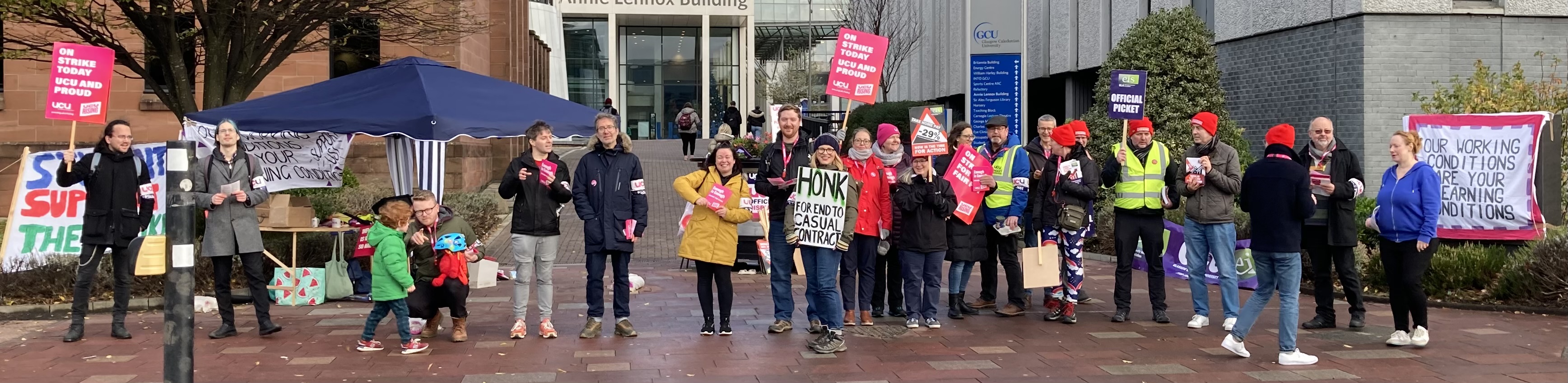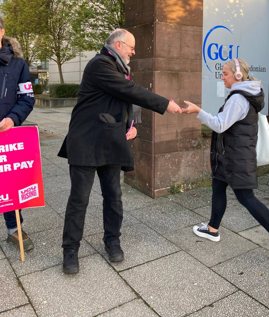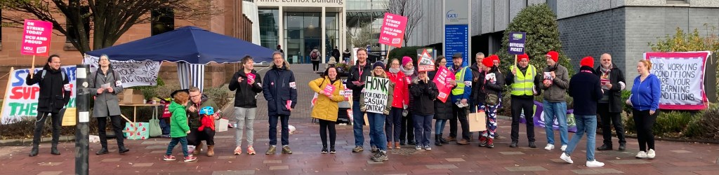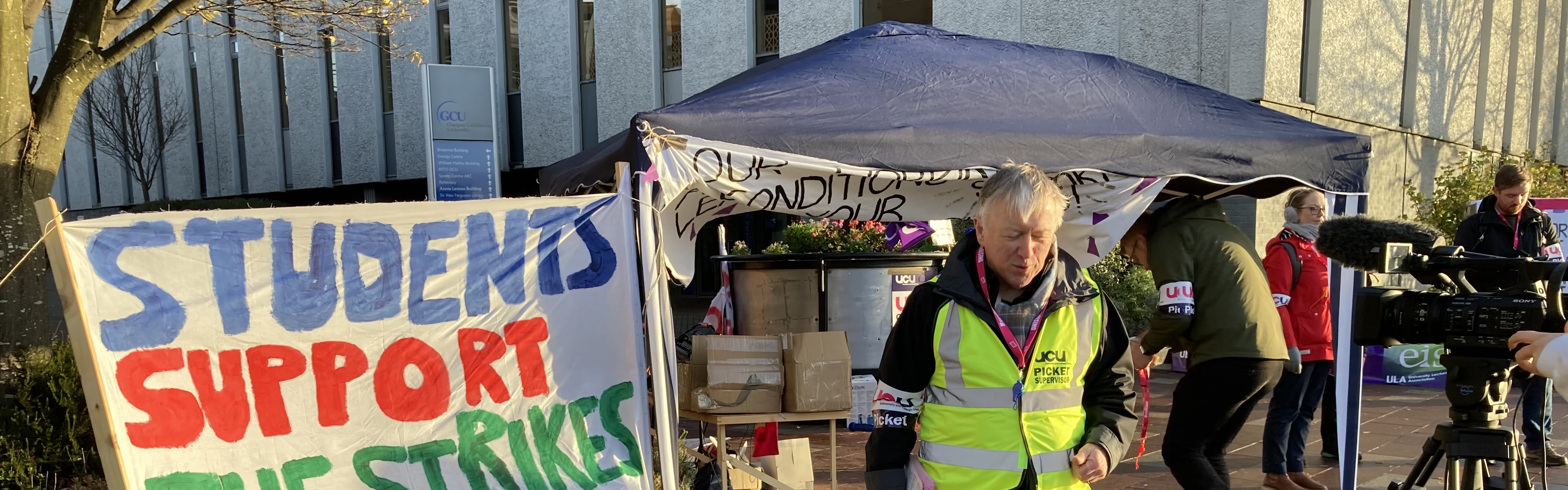Day two of strike action at GCU started well and early again though we were glad of the weights that stopped the Gazebo going skyward, given the turn in the weather. Again a great and positive response from students – including some GCU journalism students who came down to interview pickets for their ‘newsdays’ assignments.
