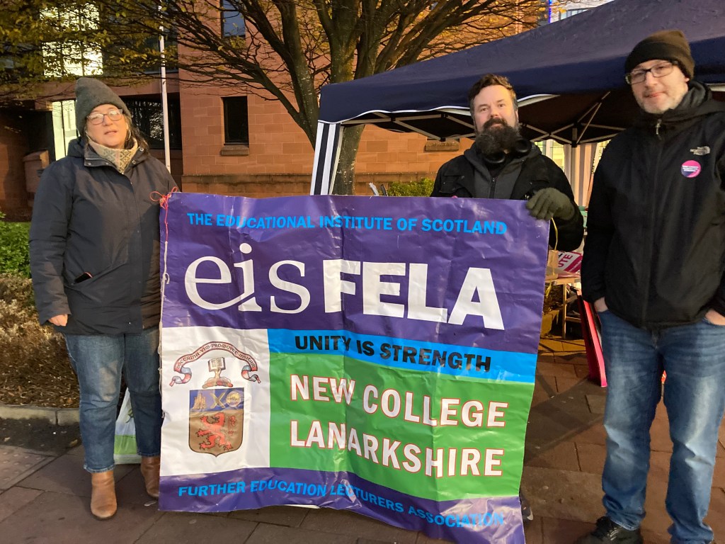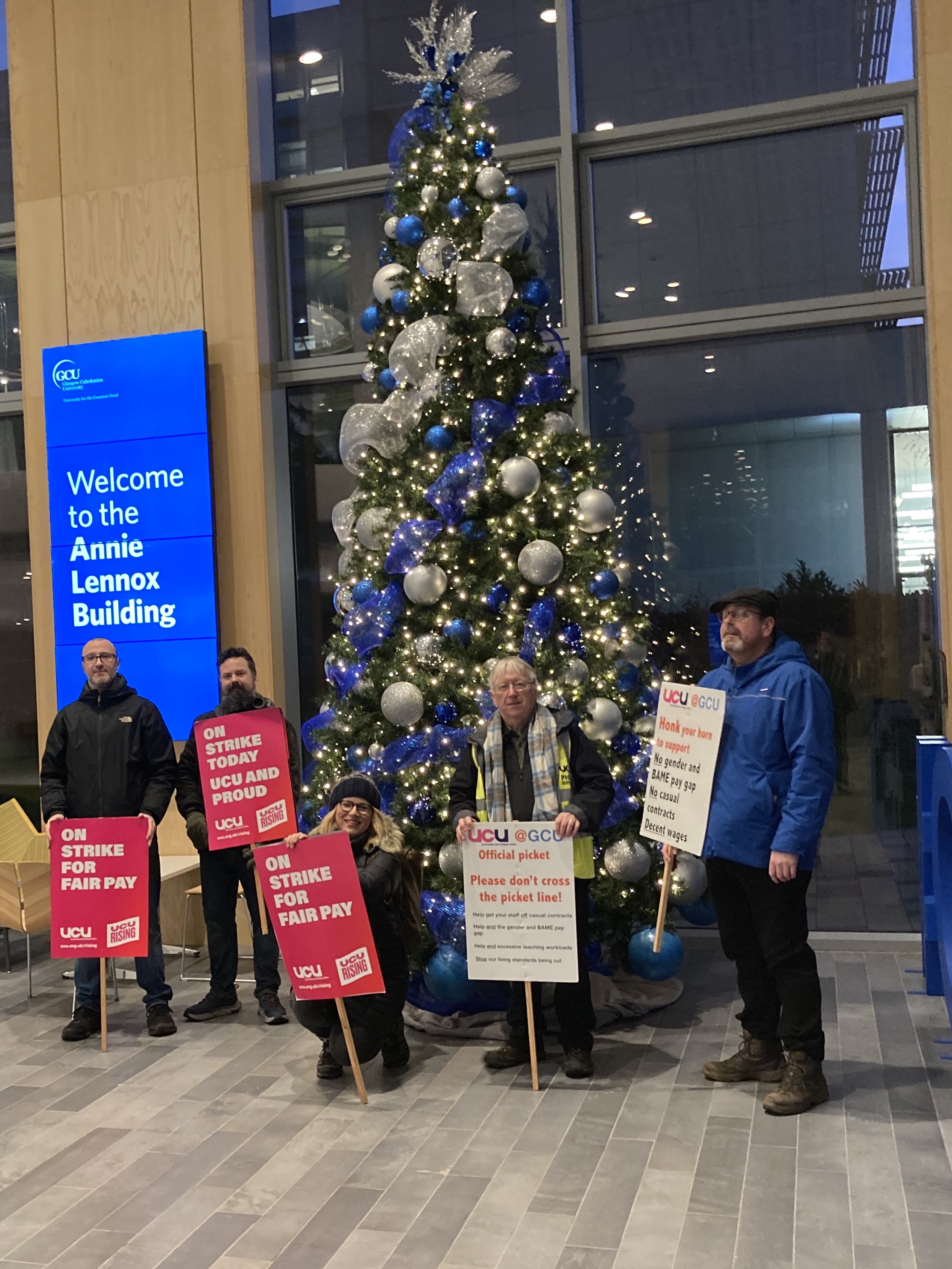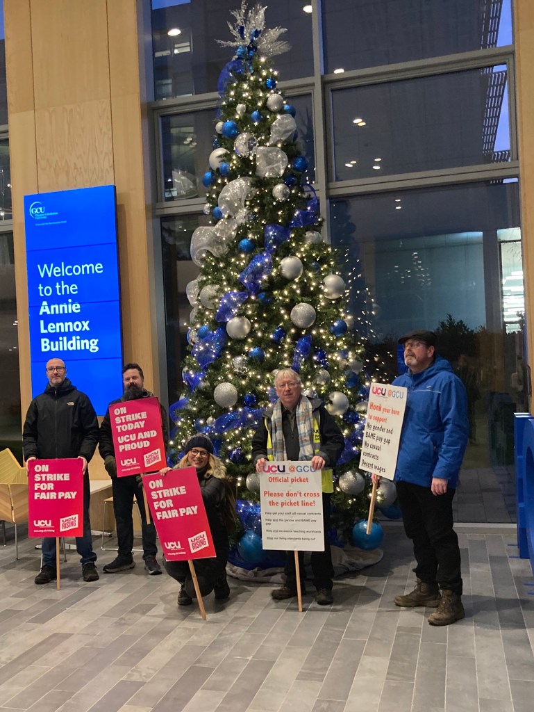 Earlier a selection of UCU Elves had made their point beside the GCU Christmas tree on their way to set up the early morning picket – in place again from 7.30 this morning.