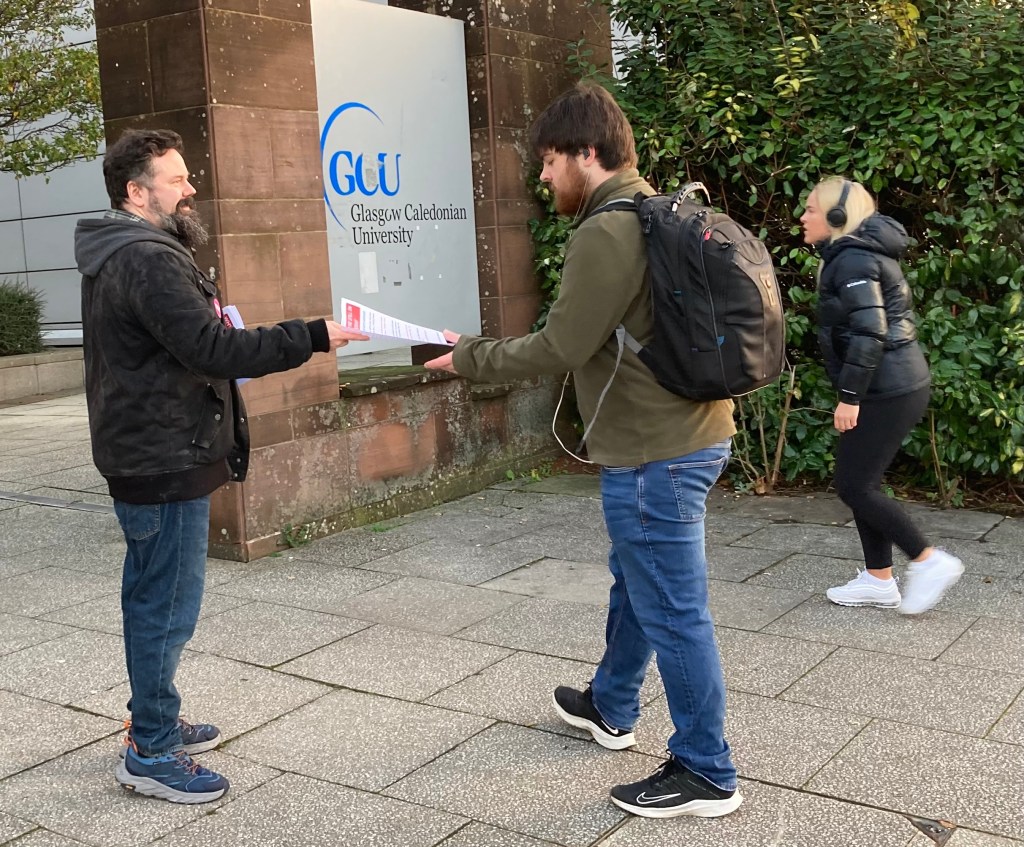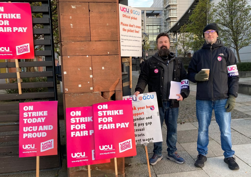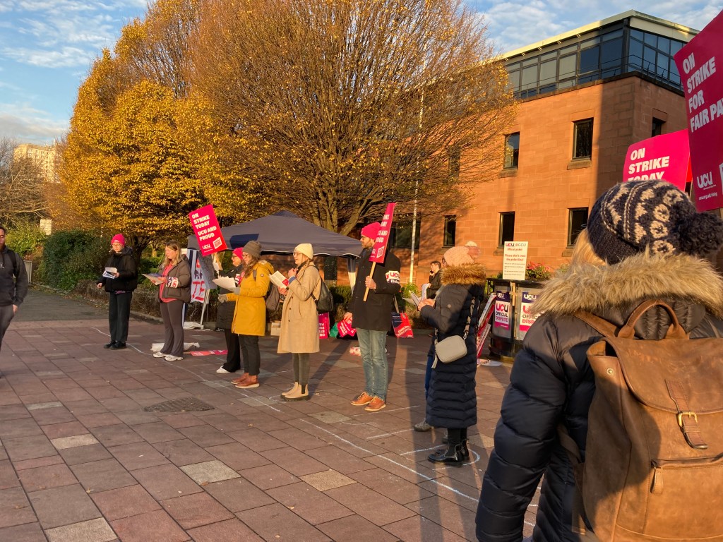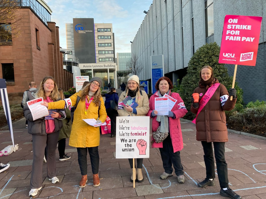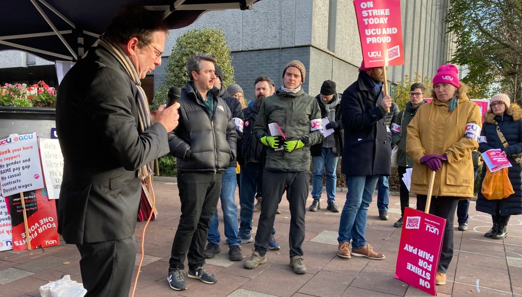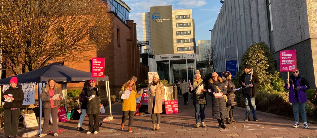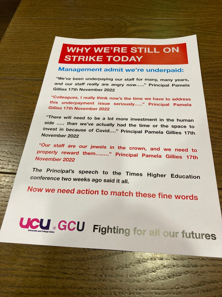 The sun shone for the GCU pickets (and why shouldn’t it!) on the third day of the UCU’s action at Glasgow Caledonian when well over 30 pickets joined the several hundred members who were striking for better pay and conditions.