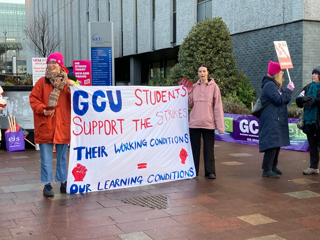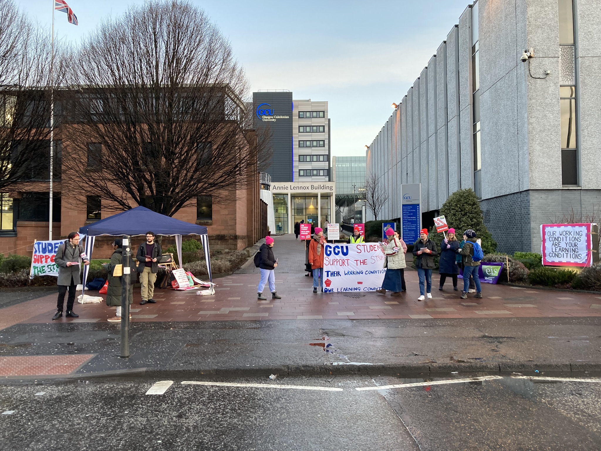 Despite some good Glasgow weather (aka dreich, dreich, dreich, and the wind blowing a hooley) UCU and EIS Union members were out before 8 am today at Glasgow Caledonian making the case for financial justice and fair pay at our ‘University for the common good.