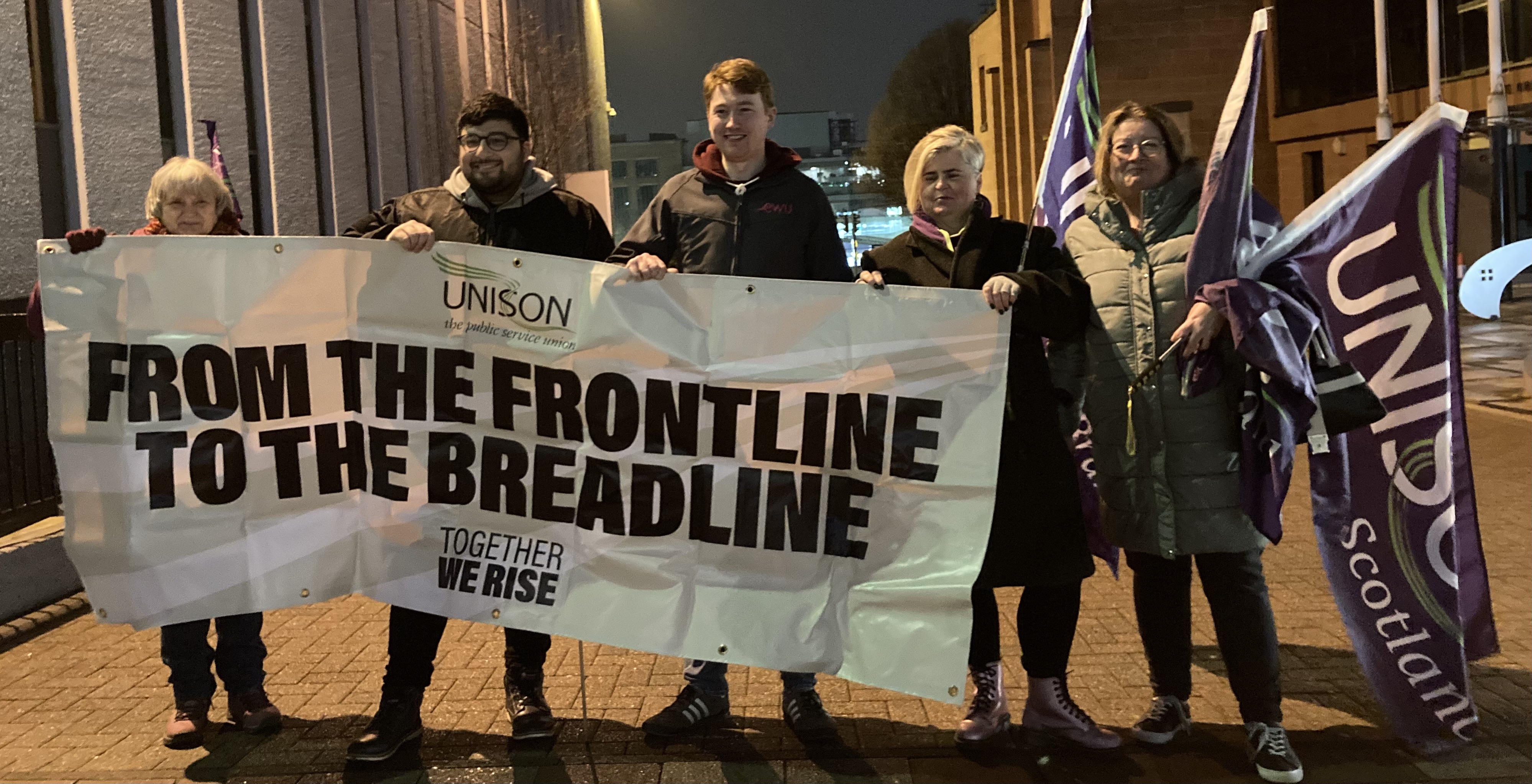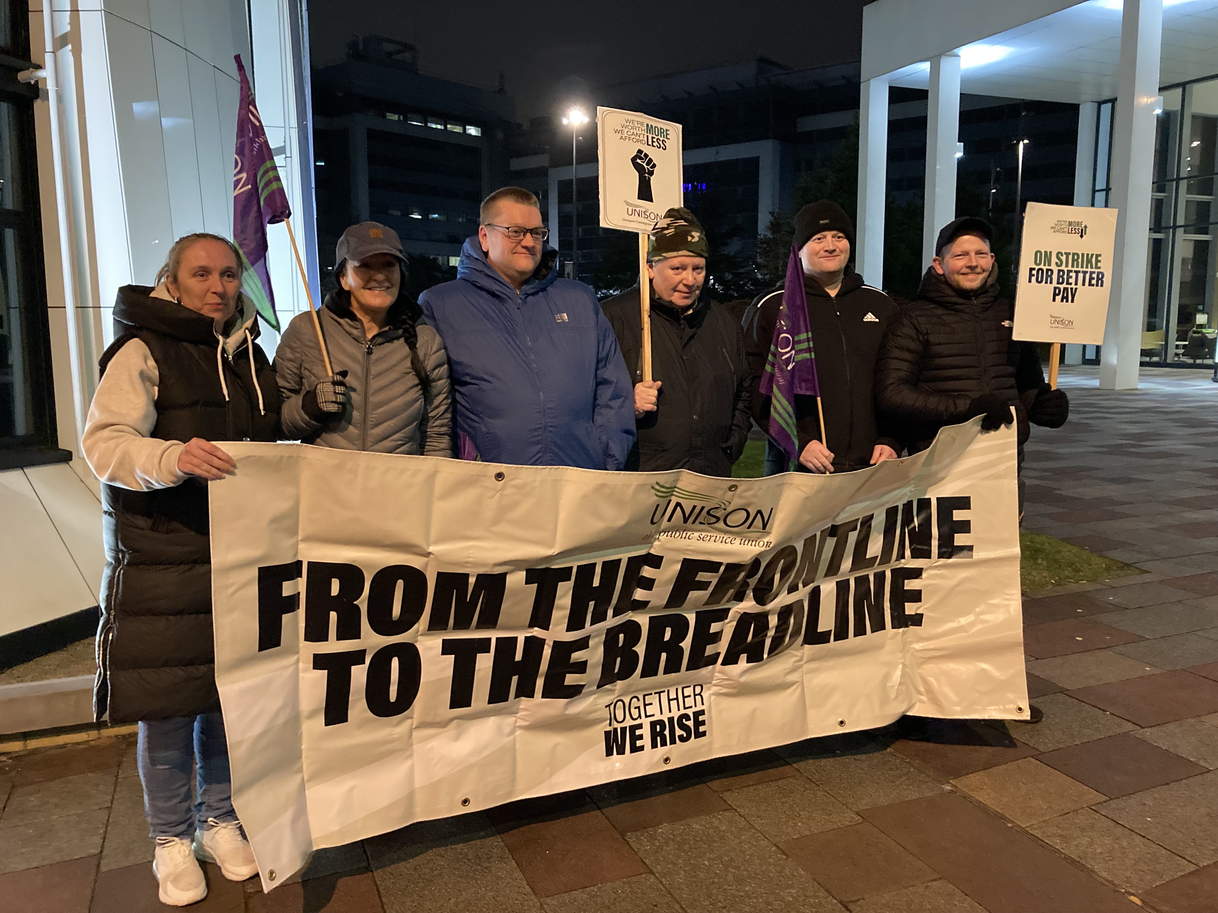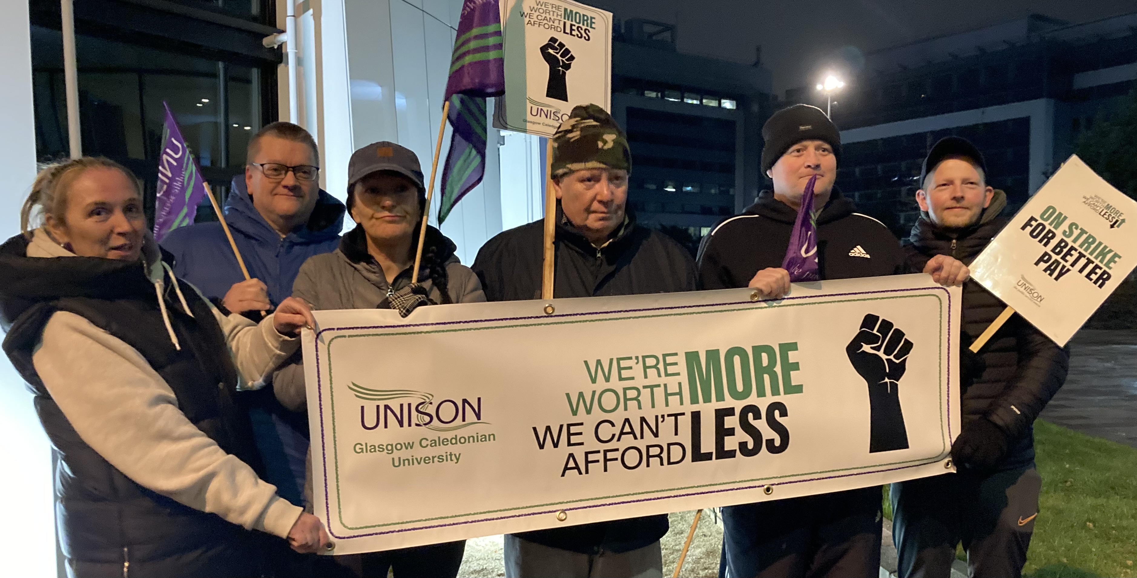 At a time when most staff were either in bed or heading there, GCU security guards joined other Unison members at the change of shift, and marched out for fair pay, making the point that many of us miss – that some of our staff work all through the night to ensure the campus is safe for all – and do this on low pay.