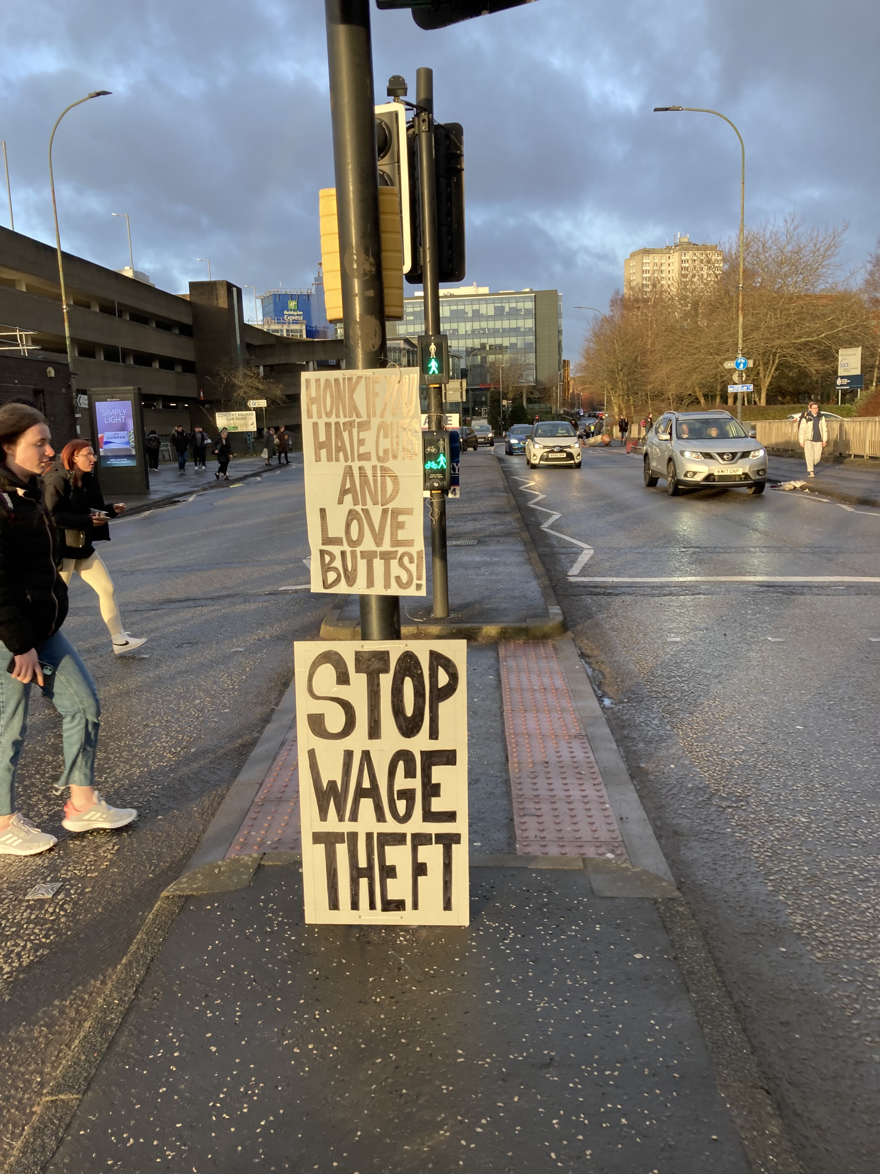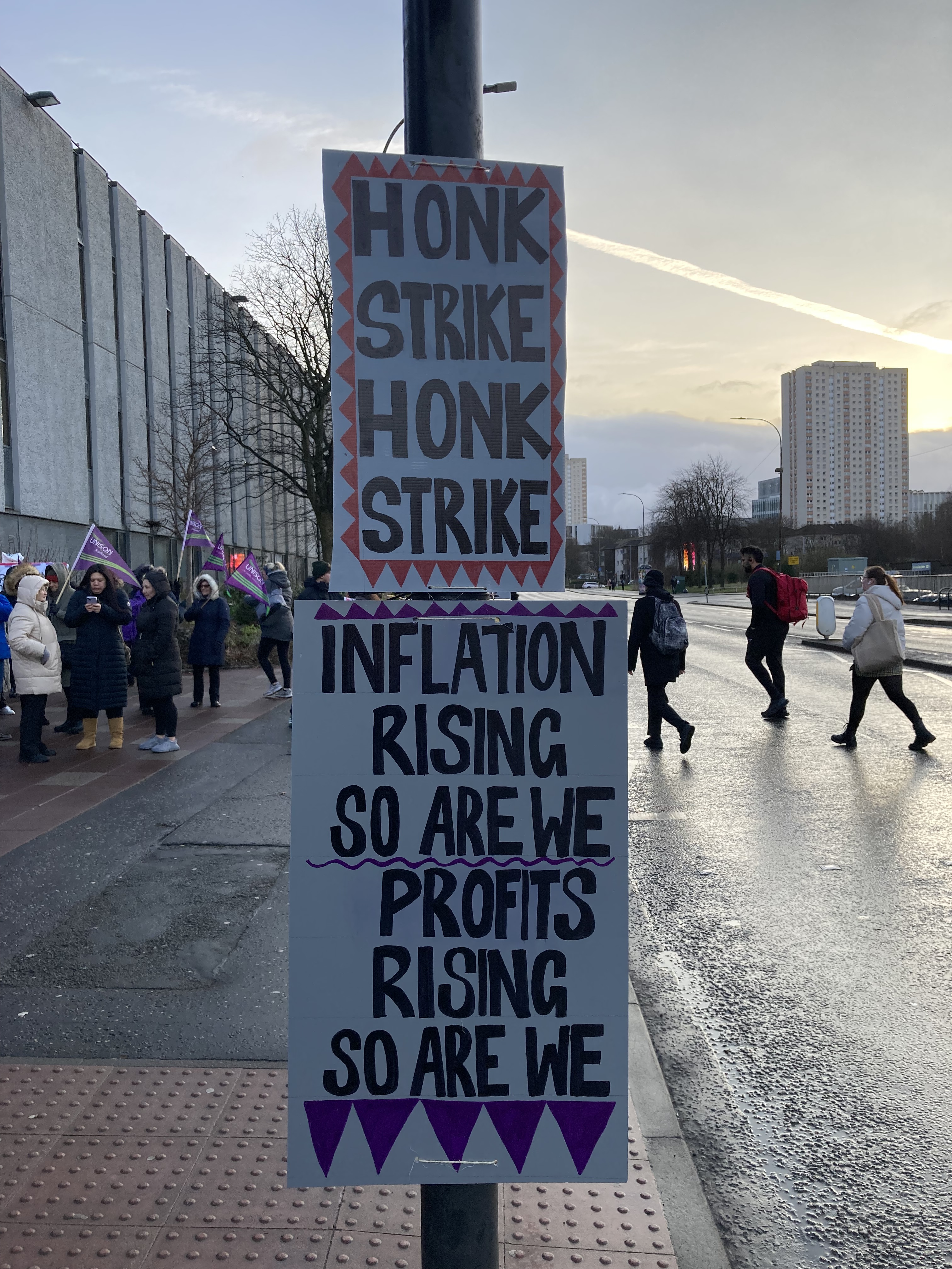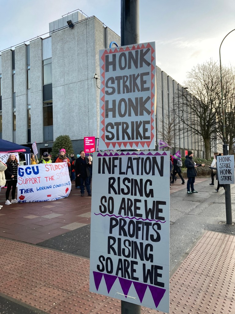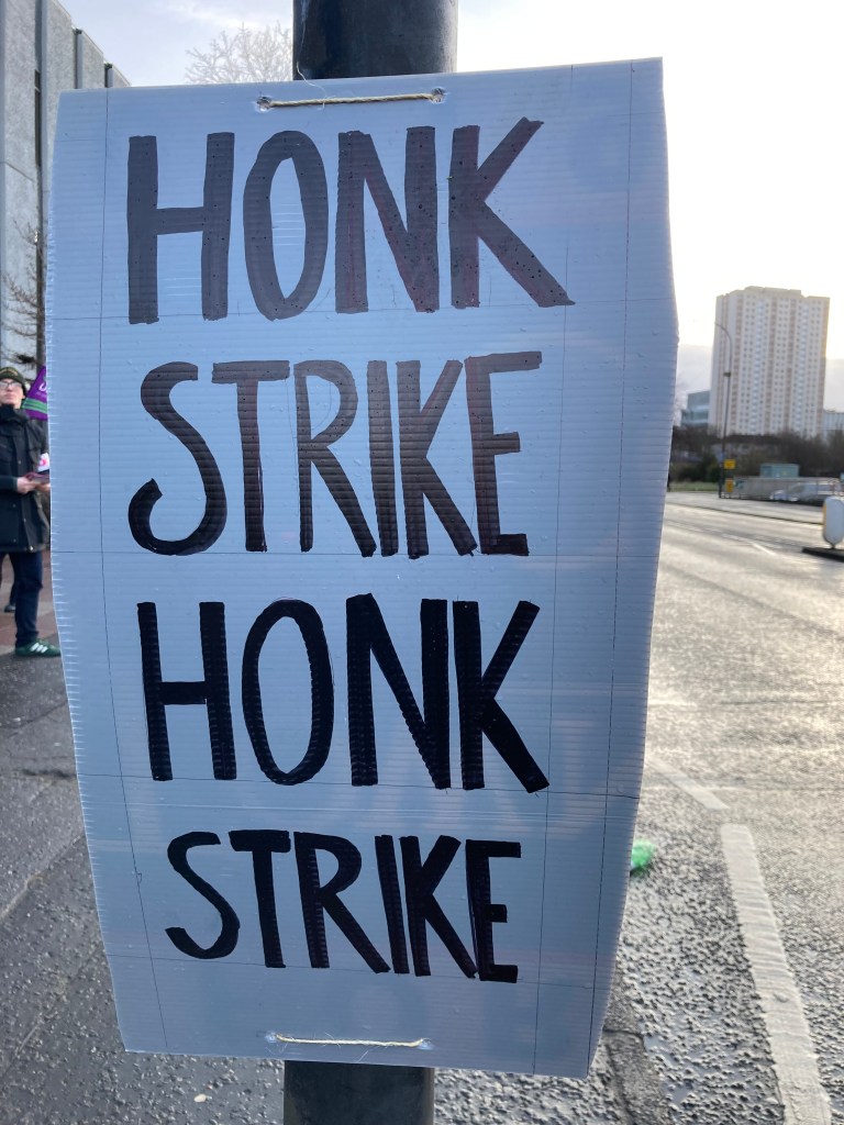 We had great support again from the public – this has been a really heartening aspect of the picket lines – it was quite deafening some times as the cars, taxis and lorries, reacted to our new ‘Honk Strike, Honk Strike’ placards ( thanks Alice and Sarah).