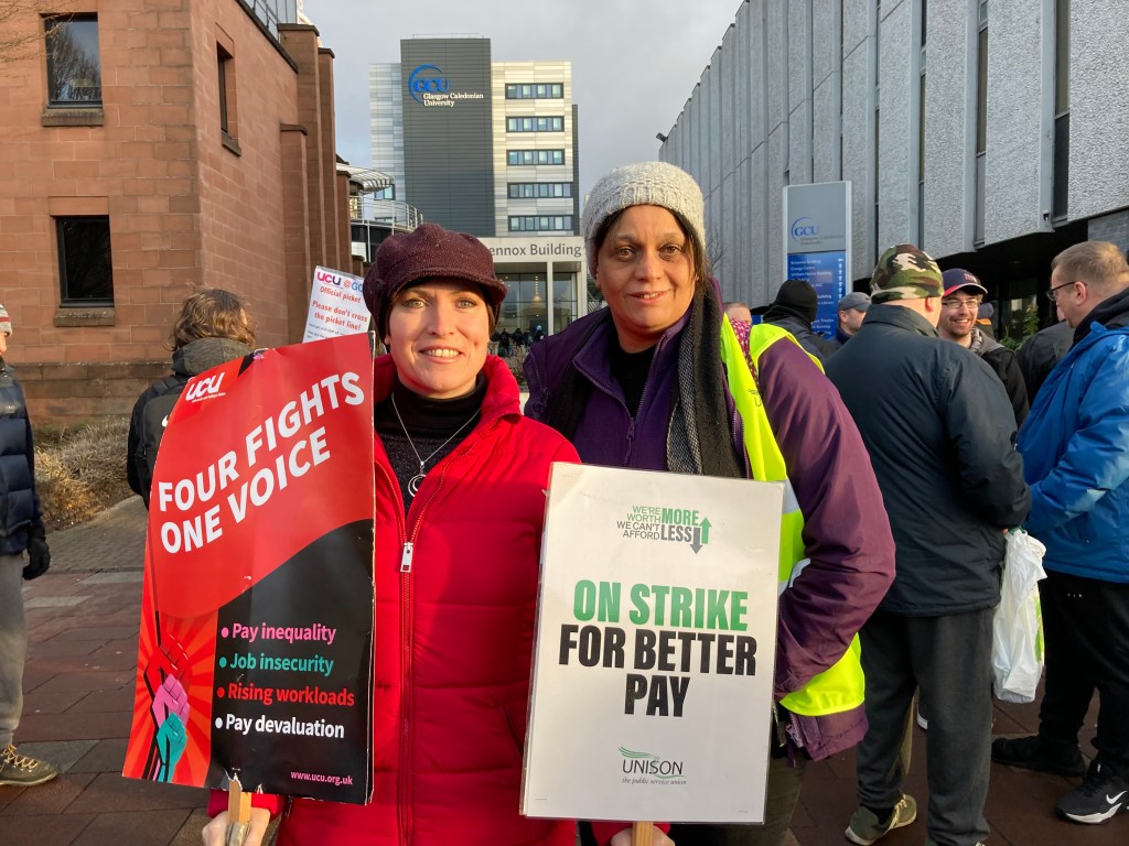 This good humoured rivalry continued throughout the morning although the provision of a UCU Gazebo, some teas and coffees and some cracking Spotify playlists did have the cleaners and UCU members dancing about on the pavements outside GCU. It was that sort of picket – lots of laughter and enjoyment, but also determination that our spirits wouldn’t be dampened despite our employers current failure to come up with the goods.