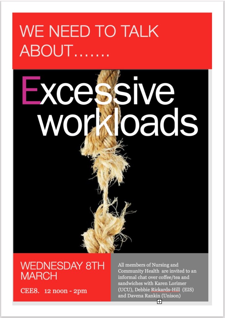 Last week’s successful joint union meeting for staff in Nursing and Community Health is the first of several to take place, looking at the issue of excessive workloads.
